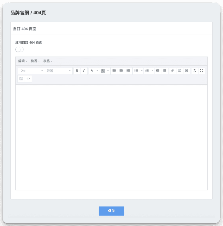 - 進入自訂404頁編輯介面,可撰寫404頁面內容:可加入品牌資訊、首頁連結或常用導航,提升用戶指引。